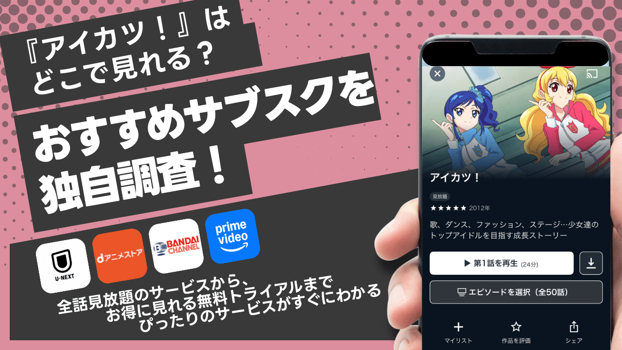 アイドルオーディション系作品として国民的人気を誇る『アイカツ!』は、様々な動画配信サービスで視聴できます。 本記事では、『ア...